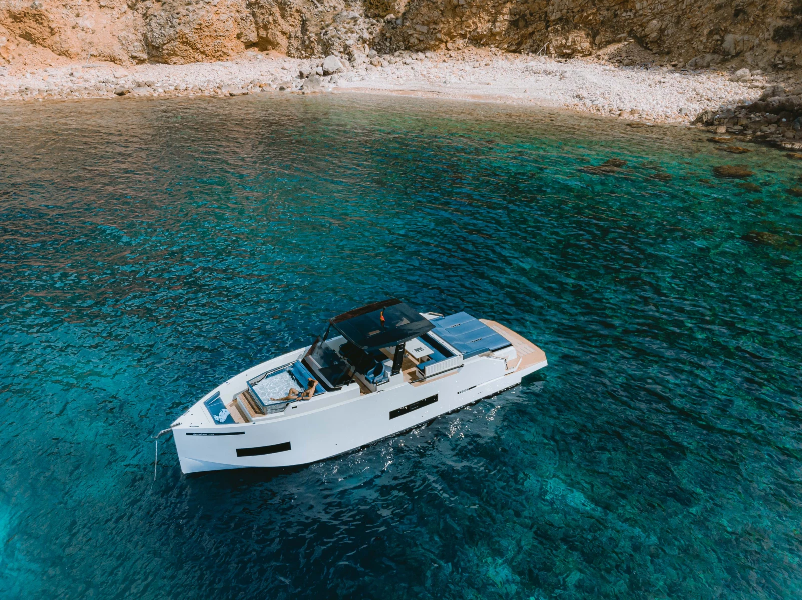 - 5 large loungers to sunbathe at the back of the boat, next to a teak rear bathing platform with capacity to sit or lie down for +5 people.