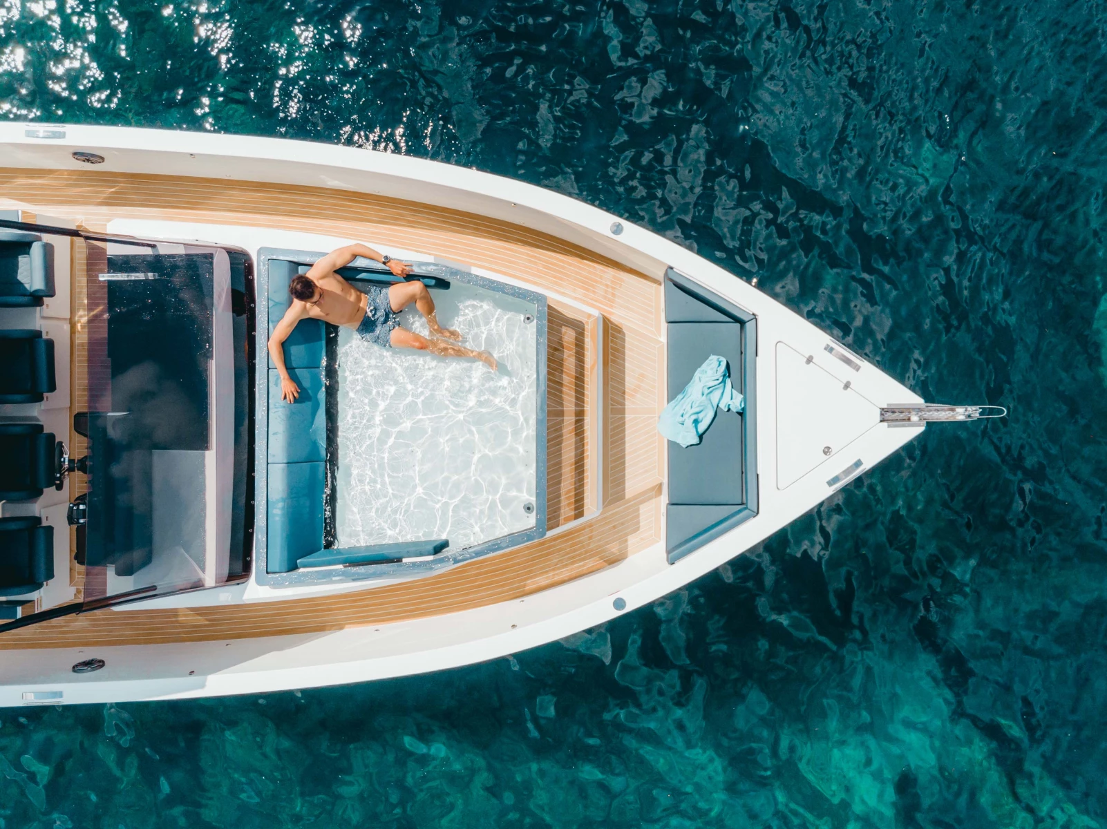 - Glass and metal pool at the front of the yacht with capacity for 3 people and convertible into a solarium area.