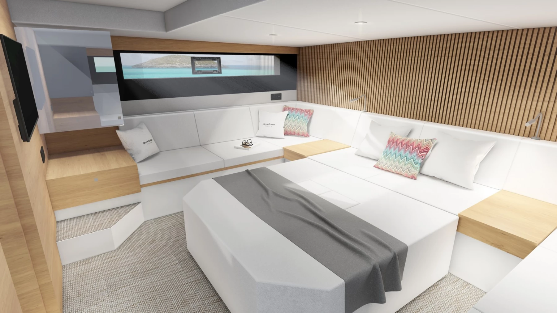 - Complete audio and TV system with Bluetooth and speakers throughout the boat.